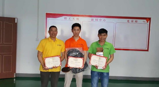 個人乒乓球比賽每個組派兩名選手,實行淘汰制晉級方式,抽簽分組決定比賽順序。乒乓球作為我國的國球,在民間的普及度是較高的。公司為了豐富員工的業(yè)余文化生活,成立了員工活動中心,為廣大員工提供了一個相互交流、切磋球技的機(jī)會。雖然同事們都沒有經(jīng)過專門的訓(xùn)練,但也都能信手拈來。比賽現(xiàn)場不時傳來熱烈的喝彩聲,興奮的“好球”聲不斷。本次比賽的第一名是王李波;第二名是熊波;第三名是陶總。